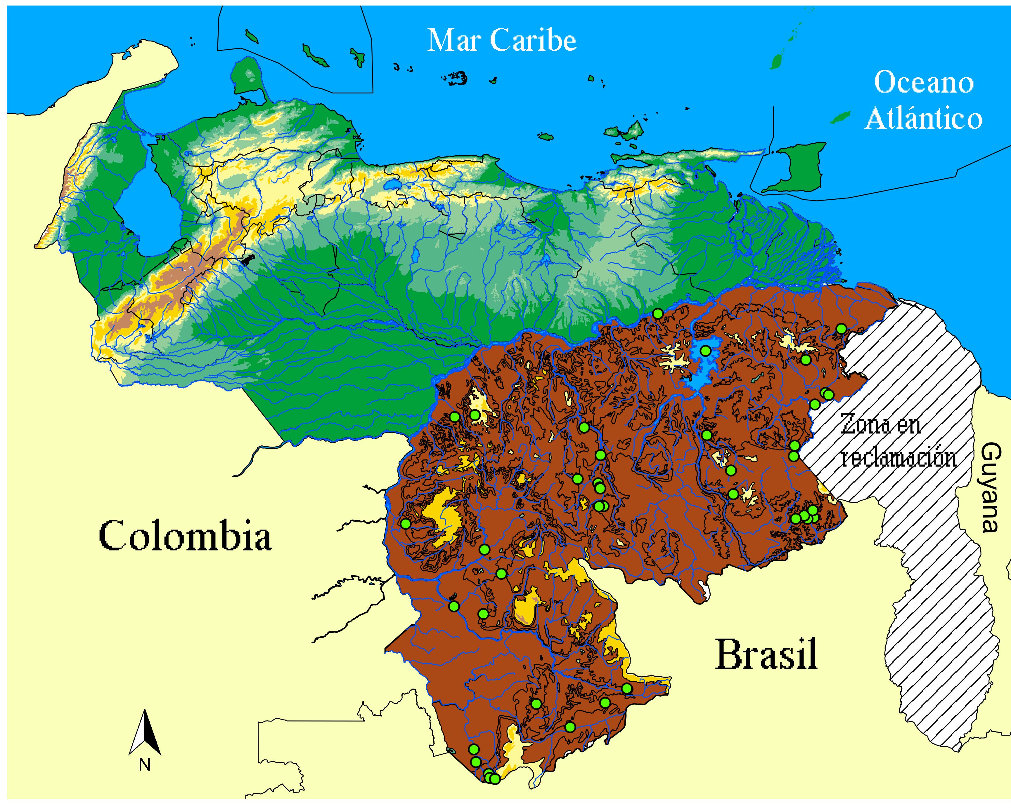 | actual | 16:25 21 ene 2014 | ![]() | 3460 × 2775 (1,11 MB) | Caimandres (Discusión | contribuciones) | Área de distribución y localidades (puntos verdes) donde se ha colectado o reportado la presencia de Paleosuchus trigonatus en Venezuela. |